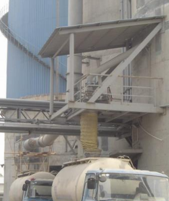 庫內部分通過支架吊掛在水泥庫內部,以10%的斜度放置,以使水泥料倉內的水泥粉呈流態(tài)化(此高壓壓縮空氣由用戶自備羅茨風機或由廠內壓縮空氣總管經減壓后接入)。“出料連接槽”、“輸送斜槽”在水泥庫外按出料順序連接同樣以10%的斜度放置,正常使用時打開。“卸料閘門”用來控制散裝機裝車時的水泥落料狀態(tài);“斜槽風機”用來使輸送斜槽內水泥物料流態(tài)化。散裝機為其主體設備,其下料頭伸縮長度為1.6米,以適應不同車型的裝車要求。本散裝機伸縮管下降至罐形容器入料口位置的停止及料裝滿時卸料閘門的關閉均為自動控制,下料頭的內、外伸縮管間接除塵器,裝車時無粉塵飛揚。