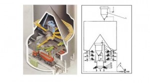 IBAU庫采用德國漢堡公司的連續(xù)均化技術(shù)。在外部帶一攪拌倉,庫底中心設(shè)一大圓錐,庫內(nèi)生料的重量通過該錐傳遞給庫壁,庫底環(huán)形空間被分成向中心傾斜10度的6個充氣區(qū),每區(qū)裝設(shè)3種規(guī)格的6個充氣箱。充氣卸料時生料先被送至一條徑向布置的充氣箱上,再經(jīng)過錐體下部的出料口由空氣斜槽送入庫底中央4000mm計量倉中。卸料時,生料在自上而下的流動過程中,切割水平料層而產(chǎn)生重力混合 作用,進入攪拌倉后又連續(xù)充氣攪拌而得到進一步均化,均化效果H可達6~8,電耗0.1~0.2Kwh/t生料。